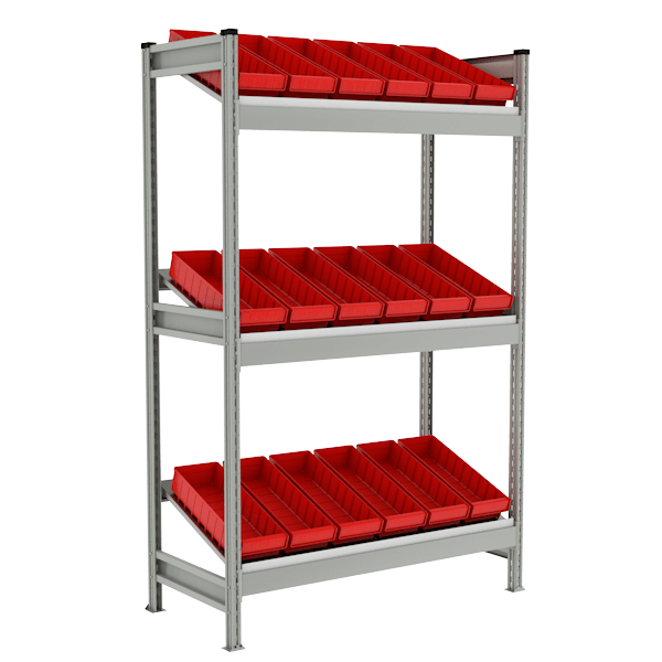 - Представляет собой металлическую сборную конструкцию с наклонными полками для хранения сыпучих материалов в пластиковых ящиках (лотках) синего либо красного цвета.