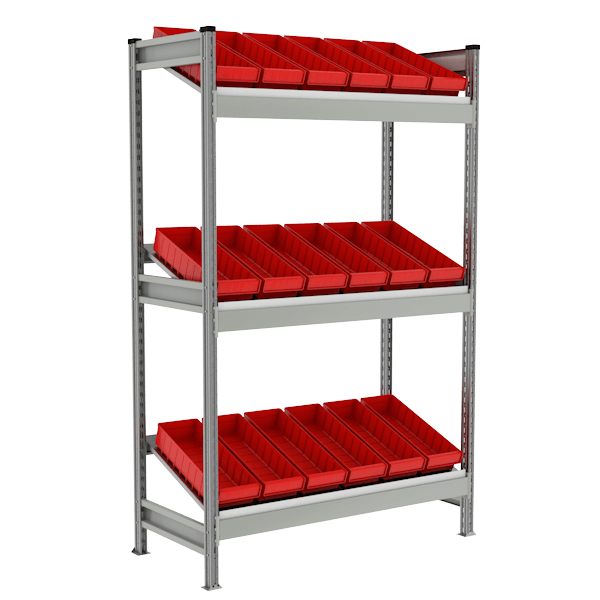 - Предназначен для хранения на наклонных ярусах грузов в пластиковых ящиках.