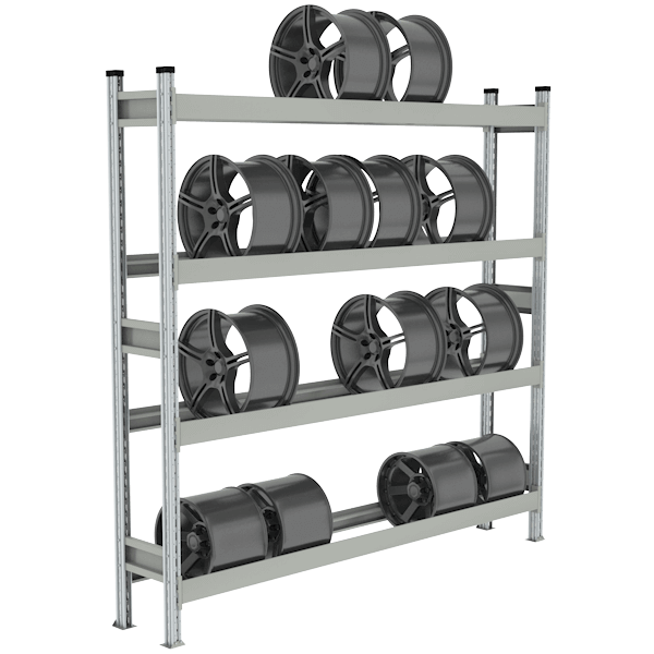 - Стеллаж состоит из рам и балок для установки колёс и дисков.