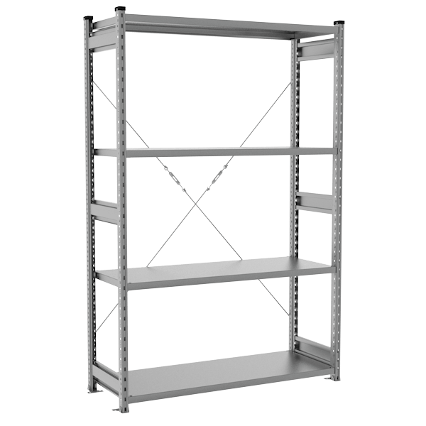 - Полки крепятся к рамам при помощи зацепов, шаг регулировки полок по высоте – 53 мм.