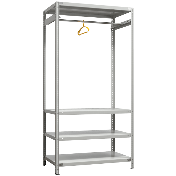 - Состоит из 4 полок и яруса-вешала со штангой для плечиков.