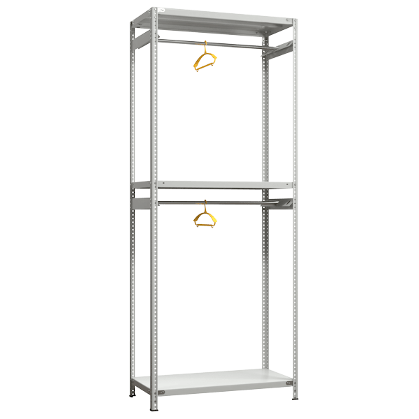 - Состоит из 4 перфорированных стоек, 2 полок и 2 ярусов-вешал с перекладиной для плечиков.