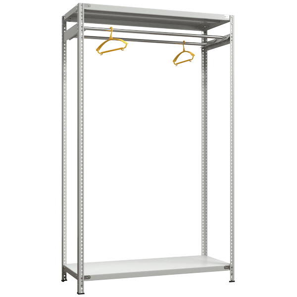 - Оснащён 4 перфорированными стойками, 2 полками и одним ярусом-вешалом со штангой для плечиков с одеждой.