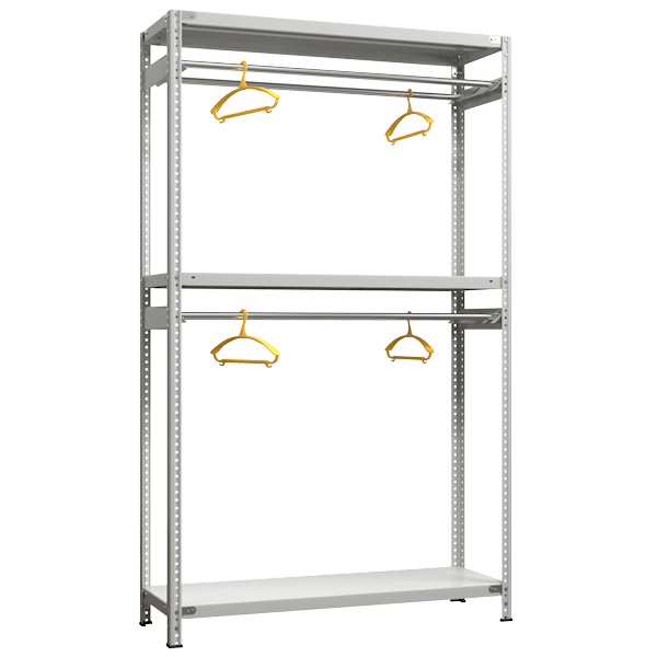 - Оснащён тремя полками и четырьмя штангами для хранения одежды.