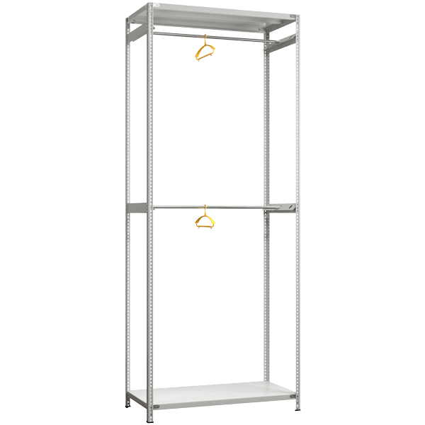 - Состоит из четырёх перфорированных полок, двух полок и двух ярусов со штангой для одежды на плечиках.