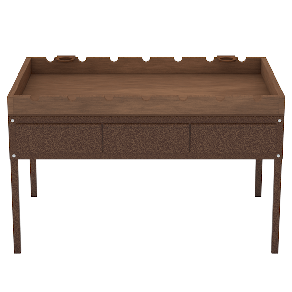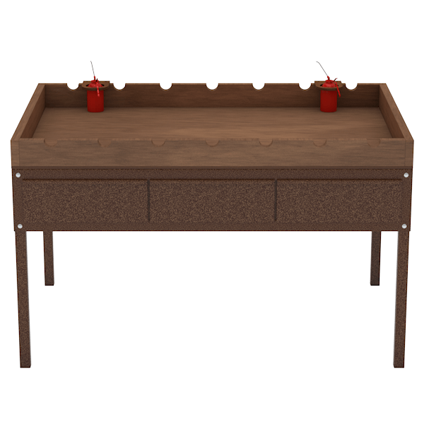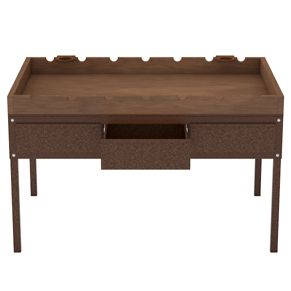 - Каркас выполнен из металла 3,5 мм; столешница – из влагостойкой фанеры; бортики – дерево 10 см в высоту.