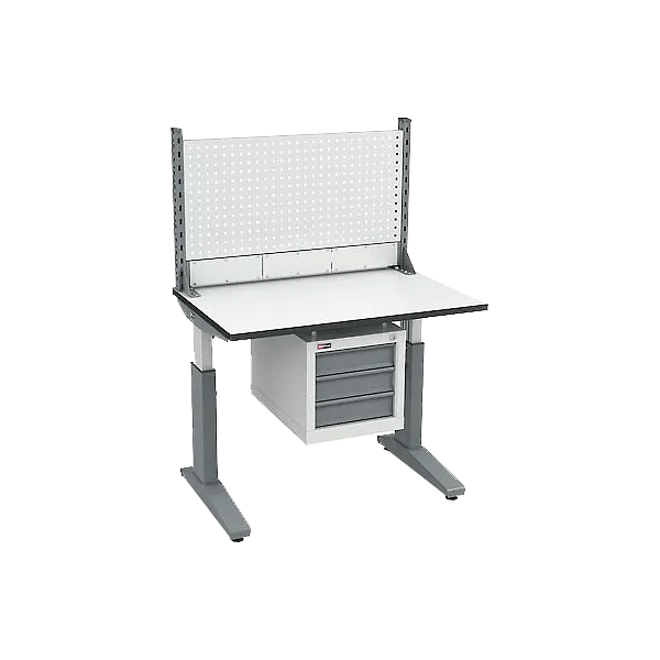 - Комплектуется экраном, к которому можно крепить полки и инструменты, а также подвесной тумбой с тремя выдвижными ящиками.