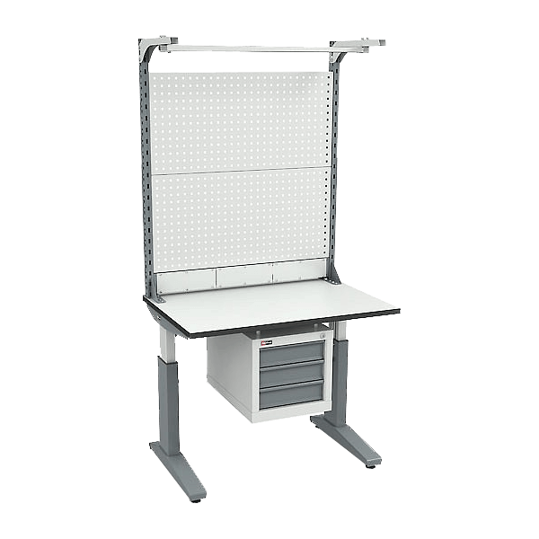 - Оборудован двойным экраном с перекладиной и подвесной тумбой с тремя выдвижными ящиками.