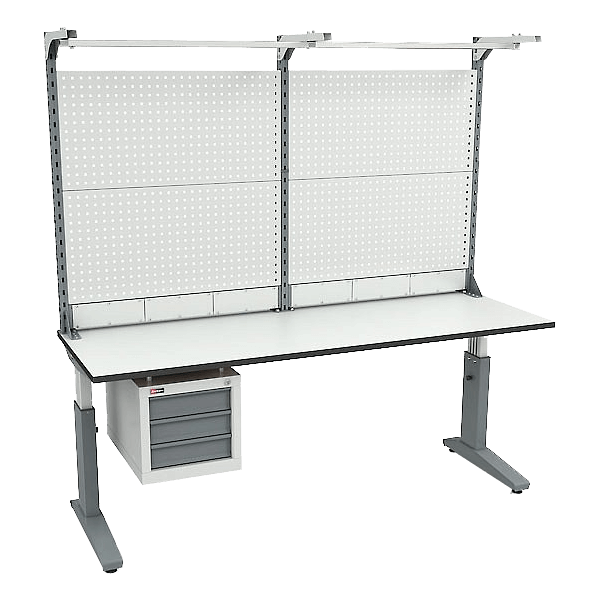 - Укомплектован двойным экраном с перекладиной и подвесной тумбой с тремя выдвижными ящиками.