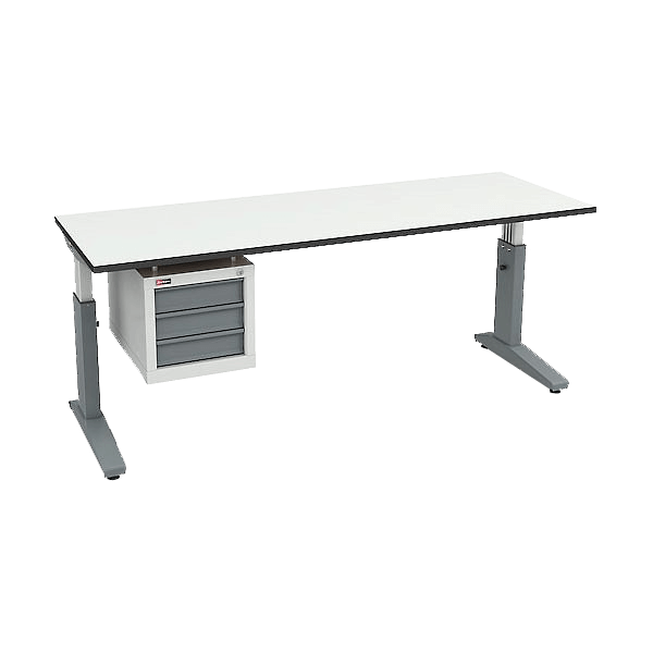 - Корпус стола и тумбы выполнены в светло-сером цвете, опоры и ящики тумбы – в тёмно-сером цвете.