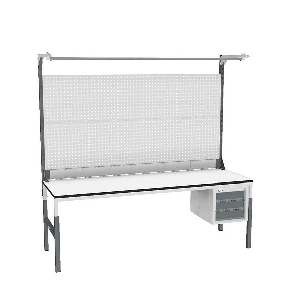 - Стол оснащён перфорированным экраном и подвесной тумбой с тремя выдвижными ящиками.