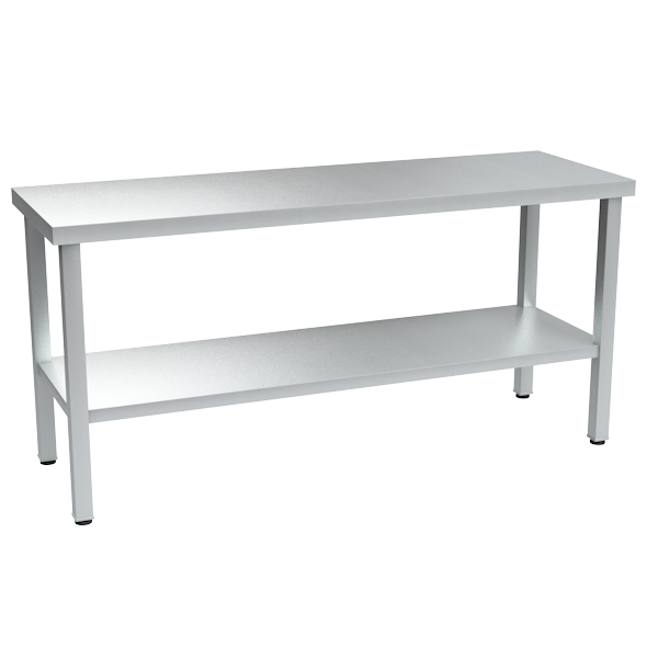 - Выполнен из нержавеющей стали, комплектуется сплошной полкой для размещения посуды и инвентаря.