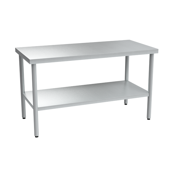 - Стол оснащён сплошной полкой для хранения посуды и инвентаря, материал полки – нержавеющая сталь толщиной 0,8 мм.