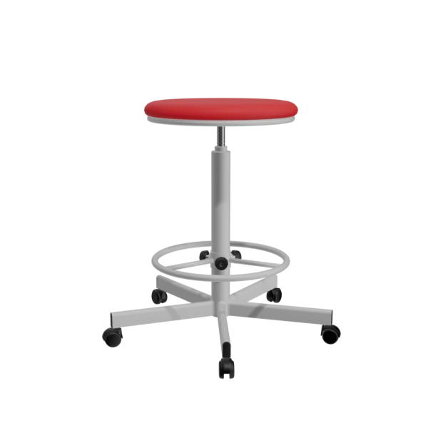 - Табурет на винтовой опоре Т02/К с красной обивкой и белым каркасом — практичный и надежный вариант для офисов, лабораторий, салонов красоты и домашнего использования.