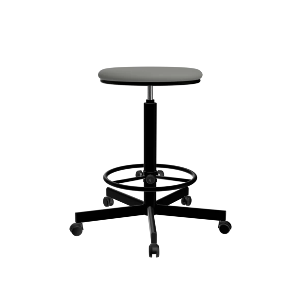 - Табурет Т02/К с серой обивкой и черным металлическим каркасом – практичный и стильный элемент для офисов, лабораторий, салонов красоты и домашних интерьеров.