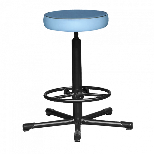 - Табурет на винтовой опоре Т02-1 с синим сиденьем и чёрным металлическим каркасом используется там, где важна прочность и надёжность: в мастерских, производственных цехах, лабораториях, пунктах технического обслуживания. Обивка из искусственной кожи яркого синего цвета легко чистится, не собирает пыль и не подвержена быстрой деградации при контакте с маслами и легкими химическими средствами.