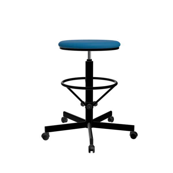 - Табурет на винтовой опоре с усиленной опорой для ног Т03/К (на колесах), обивка синяя, каркас черный — удобное и надежное решение для лабораторий, салонов красоты и мастерских.