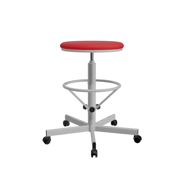 - Табурет на винтовой опоре с усиленной опорой для ног Т03/К (на колесах), обивка красная, каркас белый — это современное и удобное решение для офисов, салонов красоты и других рабочих зон, где важен комфорт и мобильность.