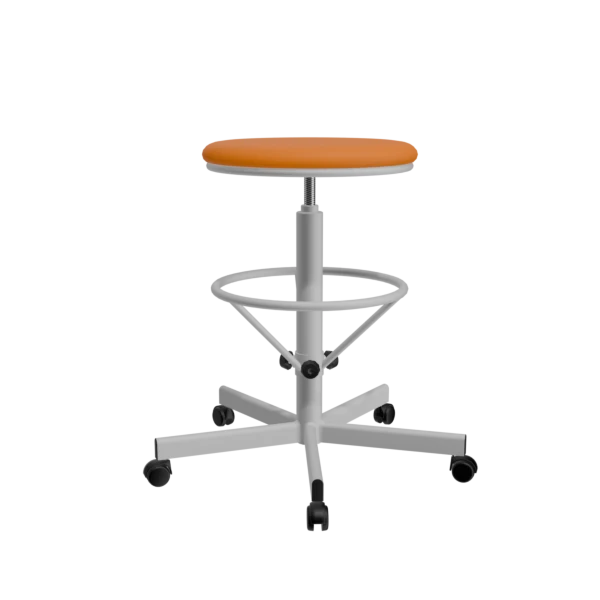 - Табурет на винтовой опоре с усиленной опорой для ног Т03/К (на колесах), обивка оранжевая, каркас белый — идеальный выбор для офисных и рабочих помещений, где важен не только комфорт, но и мобильность.