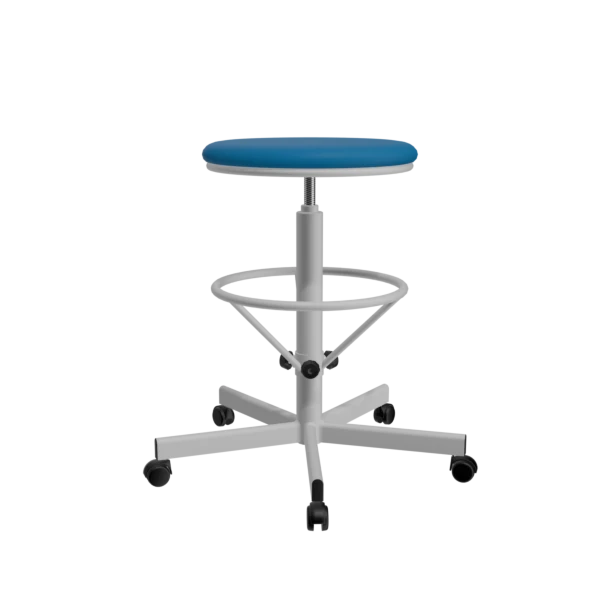 - Табурет на винтовой опоре с усиленной опорой для ног Т03/К (на колесах), обивка синяя, каркас белый – надежное и удобное решение для лабораторий, салонов красоты и производственных помещений.