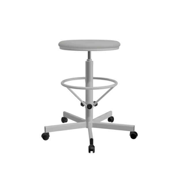 - Табурет на винтовой опоре с усиленной опорой для ног Т03/К (на колесах), обивка светло-серая, каркас белый – надежный и удобный вариант для лабораторий, салонов красоты и рабочих пространств.