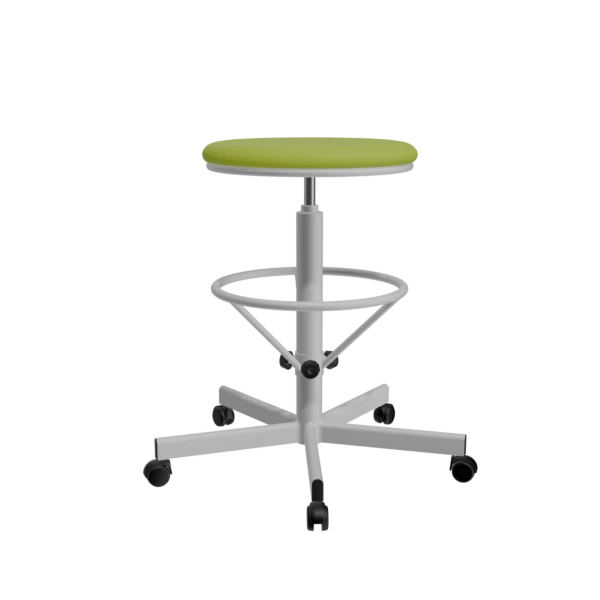 - Пятилучевое основание с колесами гарантирует плавное и безопасное перемещение табурета по любым поверхностям без повреждения пола.