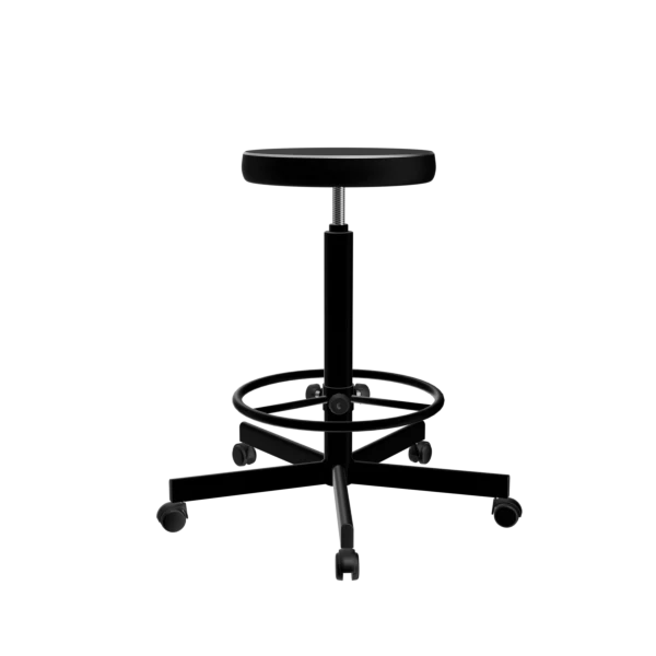- Табурет на винтовой опоре Т02-1/К, обивка черная, каркас черный — практичное и стильное решение для производственных, технических и рабочих помещений.