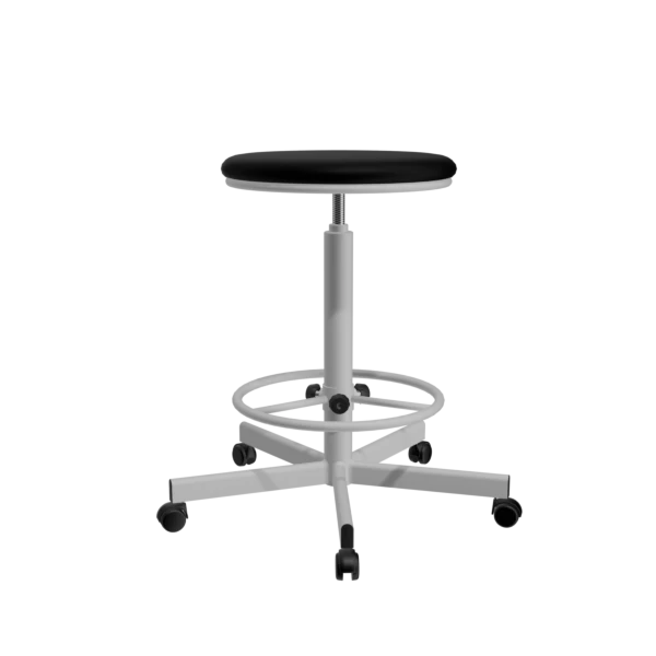 - Табурет на винтовой опоре Т02/К с черной обивкой и белым каркасом — функциональное решение для производственных, рабочих и технических помещений, а также для использования в мастерских.