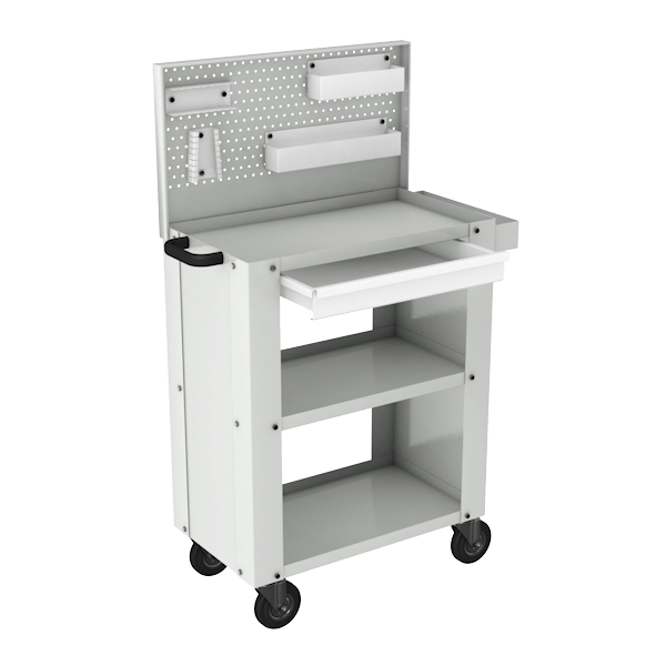 - Оснащена тремя полками, перфорированным экраном для инструментов и выдвижным ящиком.