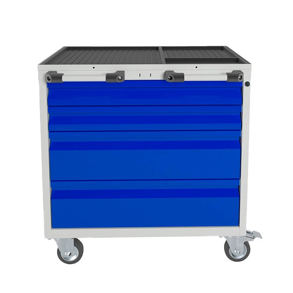- Оборудована четырьмя выдвижными ящиками с нагрузкой до 30 кг на каждый, что позволяет удобно сортировать инструмент и оснастку.