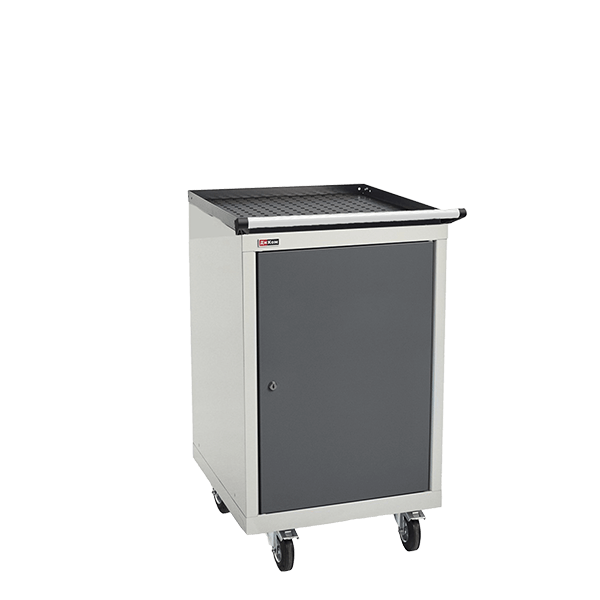 - Комплектация тумбы: 2 полки за распашной дверцей, лоток для инструментов, ручка, комплект колёс.