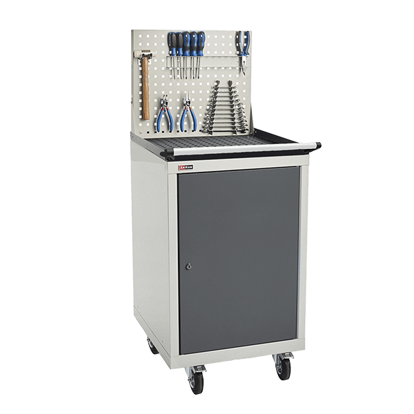 - Укомплектована 2 полками за распашной дверцей, лотком для инструментов, ручкой и комплектом колёс.