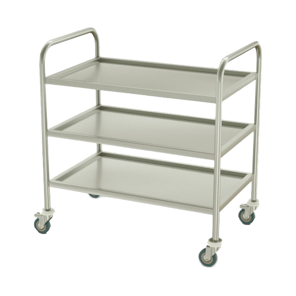 - Тележка имеет разборный каркас, выполненный из пищевой нержавеющей стали, полки, выполненные из пищевой нержавеющей листовой стали и четыре колёсные опоры.