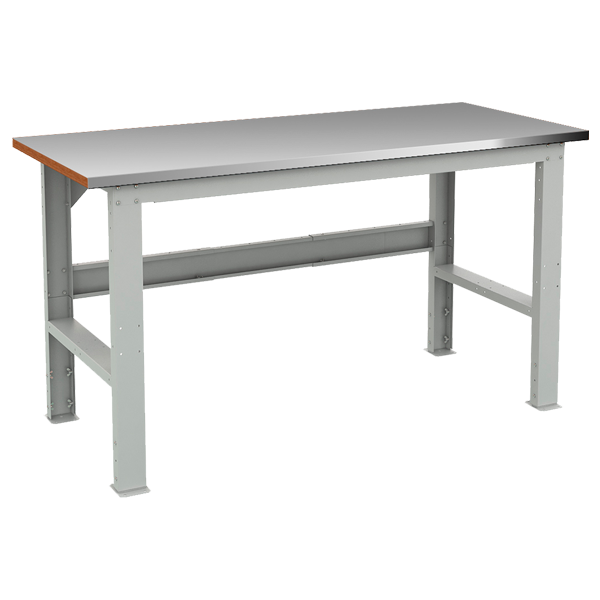- Столешница выполнена из фанеры толщиной 30 мм и стального листа толщиной 3 мм. Лист столешницы окрашен порошковой краской шагрень, цвет серый полуматовый, RAL 7038
