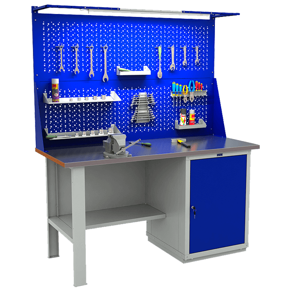 - Дополнительно верстак можно укомплектовать подвесным ящиком под столешницу и аксессуарами для инструментов.