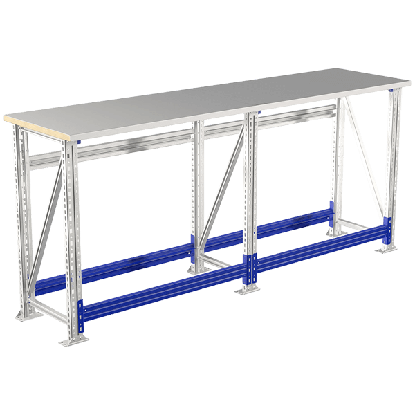 - Столешница выполнена из многослойной фанеры 24 мм + оцинкованная сталь 1,2 мм., распределенная нагрузка 300 кг. Опоры изготовлены из оцинкованного металлического профиля 55х30 мм. Шаг перфорации 50 мм.