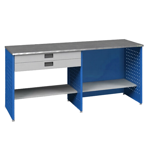 - Столешница изготовлена из МДФ толщиной 22 мм и усилена оцинкованным стальным листом 1,0 мм. Комбинированная поверхность устойчива к механическим и ударным нагрузкам, не деформируется при работе с ручным инструментом и выдерживает интенсивное ежедневное использование.