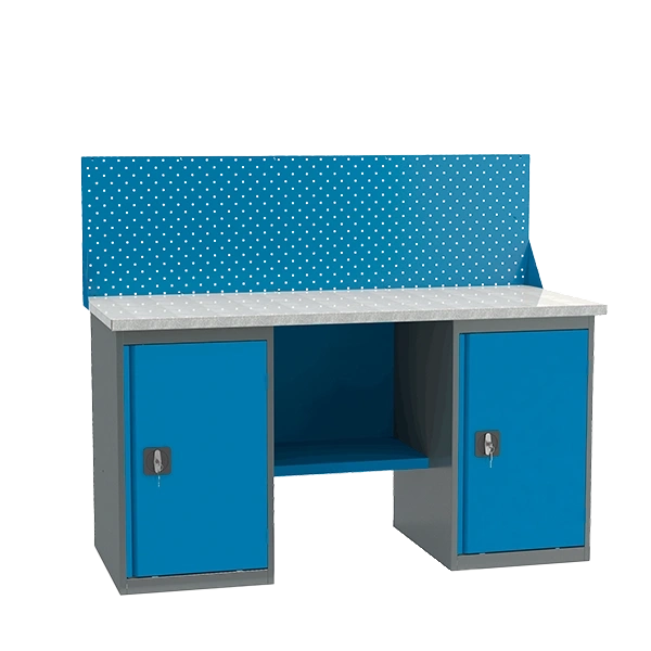 - Верстак укомплектован двумя металлическими тумбами, каждая из которых оснащена двумя переставными полками с шагом регулировки 39 мм.