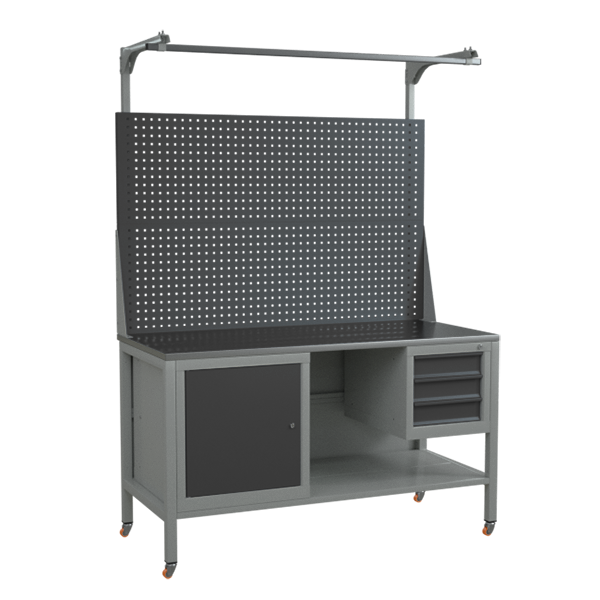 Верстак 1500 с двойным экраном, полкой, 2 тумбами и колёсами