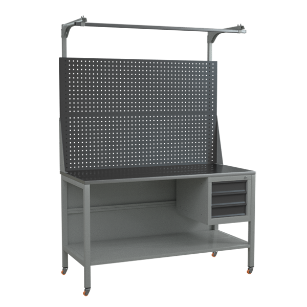 Верстак 1500 с двойным экраном, полкой, подвесной тумбой и поворотными колёсами