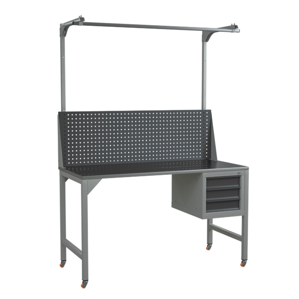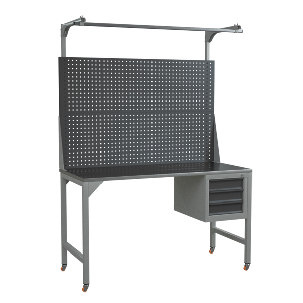 Верстак 1500 с экраном с консолями, подвесной тумбой и поворотными колёсами