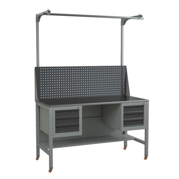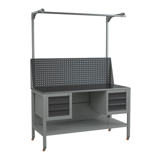 Верстак 1500 с экраном с консолями, тумбами и колёсами