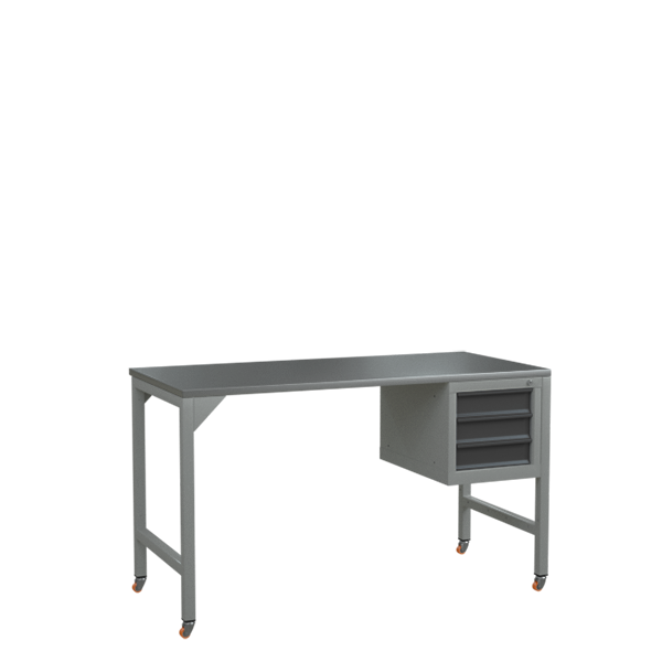 - Оснащён оцинкованной столешницей, инструментальной тумбой и 4 колёсами, 2 из которых тормозные.