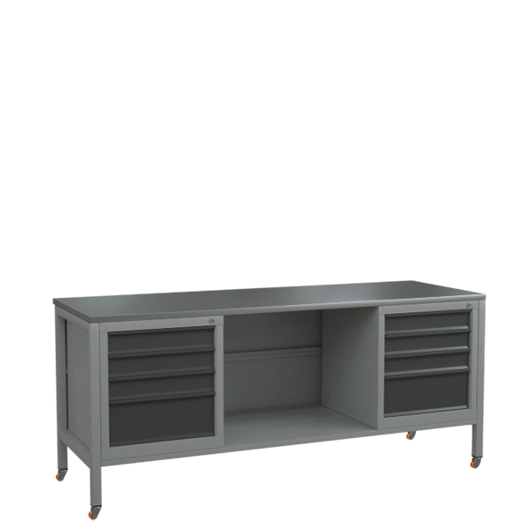 - Оснащён оцинкованной столешницей и двумя тумбами с 4 выдвижными ящиками.