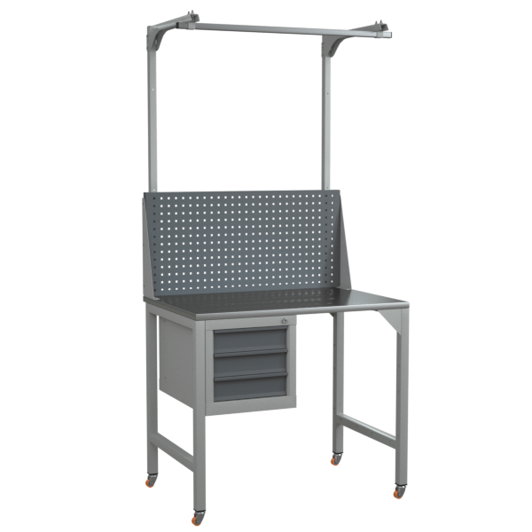 - Оцинкованная столешница, тумба с тремя выдвижными ящиками и одинарный либо двойной перфорированный экран с консолями.