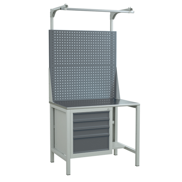 - Слесарский верстак с оцинкованной столешницей, тумбой с четырьмя выдвижными ящиками и одинарным перфорированным экраном с консолями для установки дополнительного навесного оборудования.