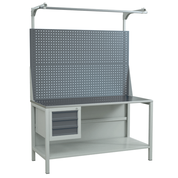 - Комплектуется перфорированным экраном с консолями и инструментальной тумбой, которая оснащена тремя выдвижными ящиками, запирающимися на ключевой замок EURO-LOCKS.