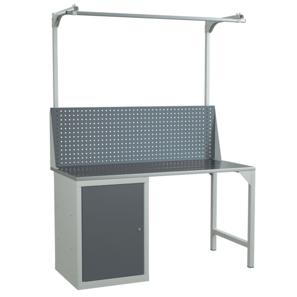 - Оснащается тумбой с распашной дверцей, а также одинарным либо двойным перфорированным экраном для размещения навесных инструментов.