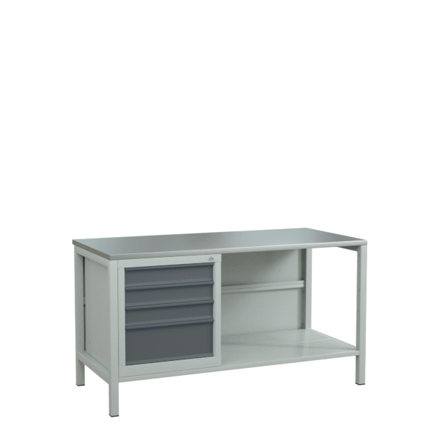 - Однотумбовый слесарный верстак оснащён подвесной инструментальной тумбой с 4 выдвижными ящиками.