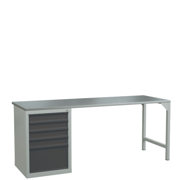 - Оснащён оцинкованной столешницей и тумбой с 5 выдвижными ящиками.